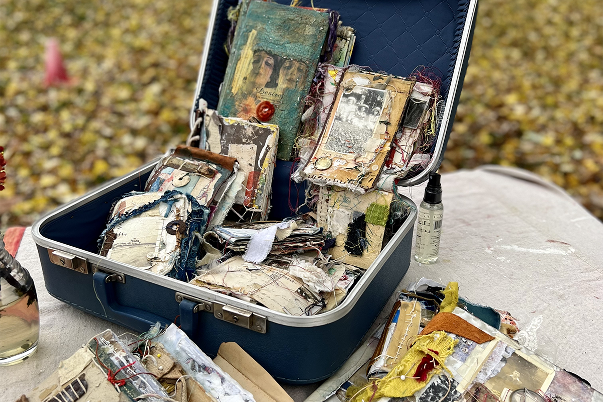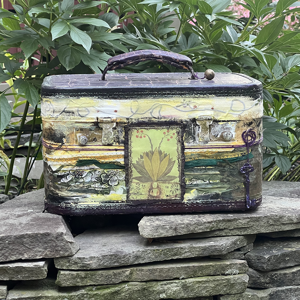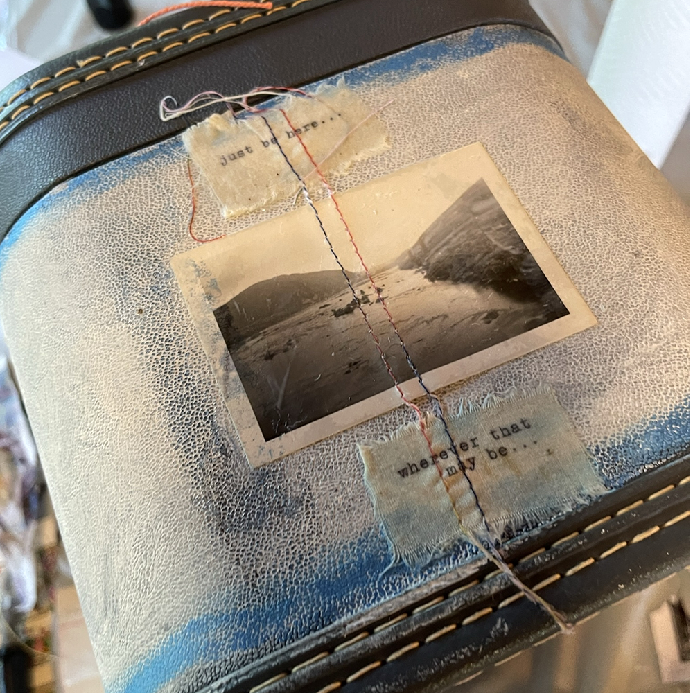 - Two different projects, an altered art journal and a small piece of vintage luggage that we will embellish and completely redo. Both projects will open our hearts up as we create using the materials around us, in my studio and on the farm, using many mixed media techniques. We will be doing all types of photos transfers, encaustics, layering, dying, rusting, painting, cyanotype, sewing on paper, stream of conscious writing and experimenting with water-soluble materials and fibers...plus whatever else I discover until we gather.