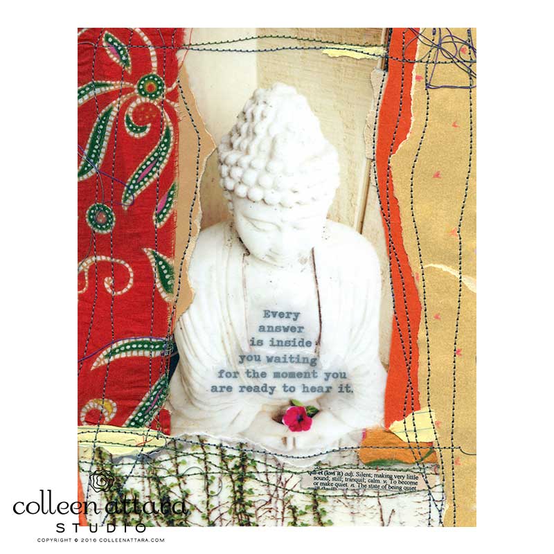 The original artwork is created from sewing separate photographs, painted bits of paper, ephemera, and my words together. These words have been inside me forever. Some are new and others have been a part of letters and journals written long ago. Enjoy. xo.