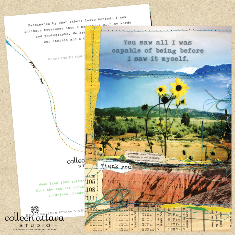 The original artwork is created from sewing separate photographs, painted bits of paper, ephemera, and my words together. These words have been inside me forever. Some are new and others have been a part of letters and journals written long ago. Enjoy. xo.