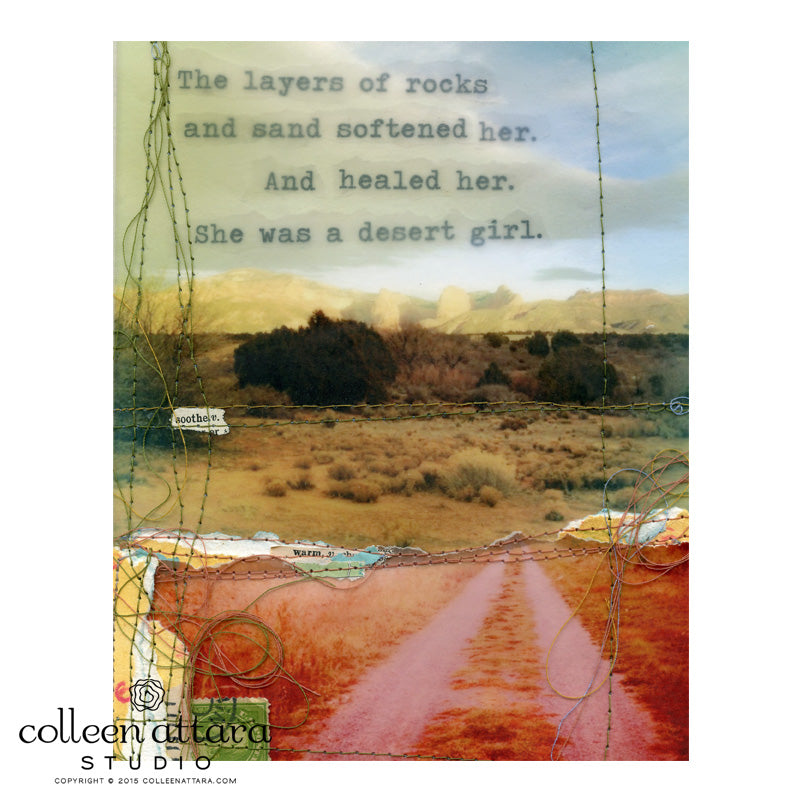 The original artwork is created from sewing separate photographs, painted bits of paper, ephemera, and my words together. These words have been inside me forever. Some are new and others have been a part of letters and journals written long ago. Enjoy. xo.