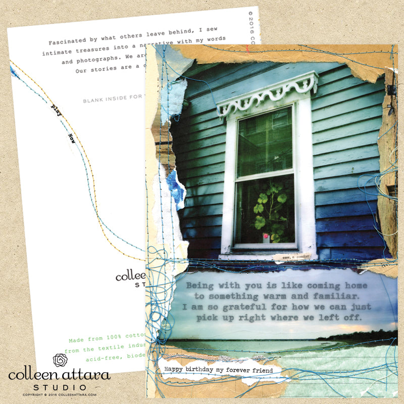 The original artwork is created from sewing separate photographs, painted bits of paper, ephemera, and my words together. These words have been inside me forever. Some are new and others have been a part of letters and journals written long ago. Enjoy. xo.