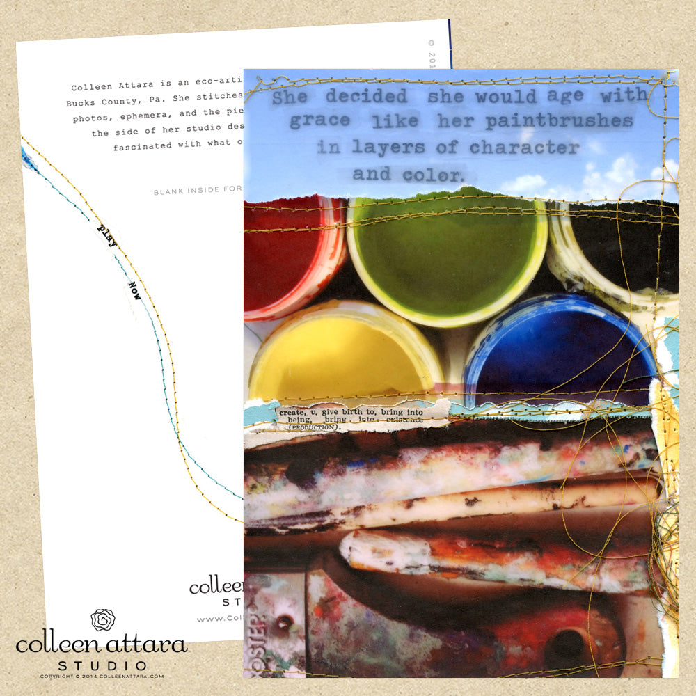 The original artwork is created from sewing separate photographs, painted bits of paper, ephemera, and my words together. These words have been inside me forever. Some are new and others have been a part of letters and journals written long ago. Enjoy. xo.
