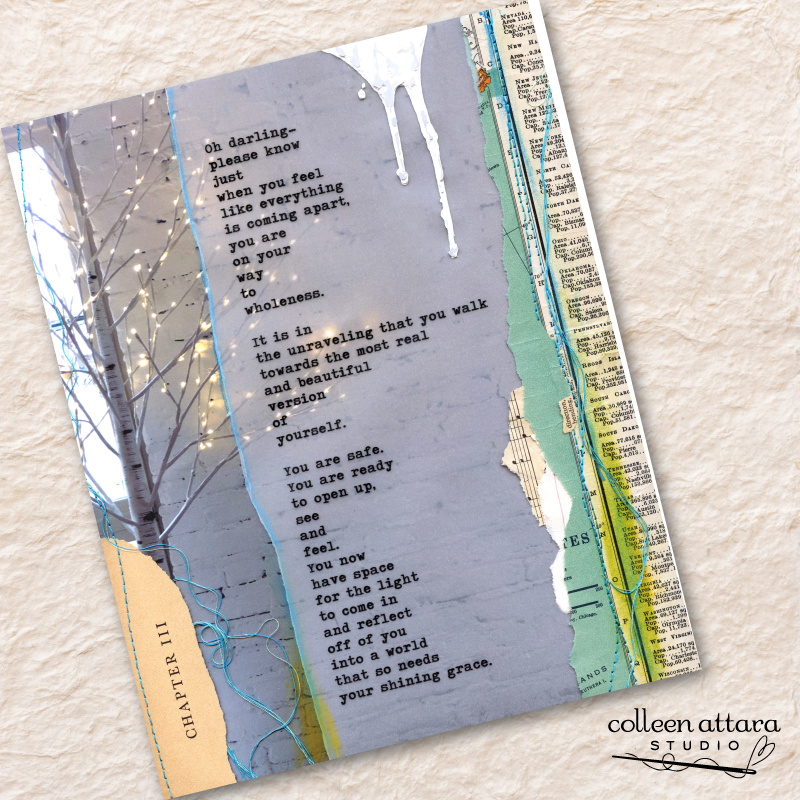 The original artwork is created from sewing separate photographs, painted bits of paper, ephemera, and my words together. These words have been inside me forever. Some are new and others have been a part of letters and journals written long ago. Enjoy. xo.