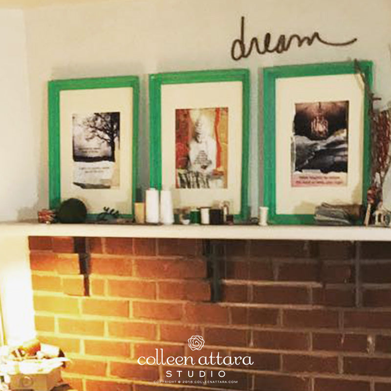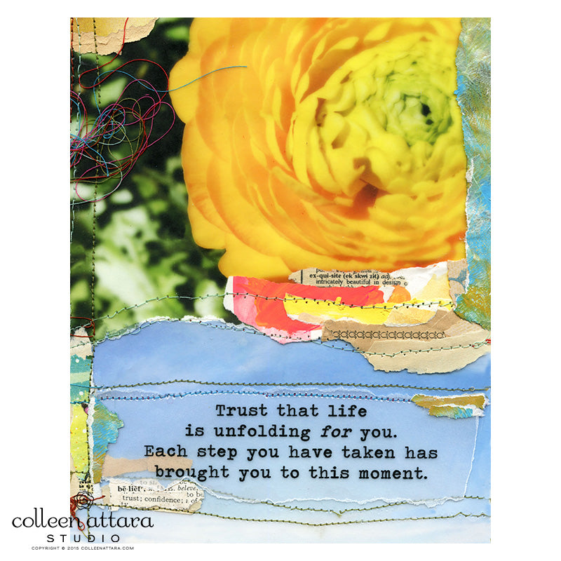 The original artwork is created from sewing separate photographs, painted bits of paper, ephemera, and my words together. These words have been inside me forever. Some are new and others have been a part of letters and journals written long ago. Enjoy. xo.